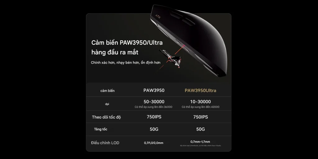 • Cảm biến quang học PAW3950: Mang đến độ chính xác cao và tốc độ phản hồi nhanh, phù hợp với cả những tựa game FPS đòi hỏi kỹ năng cao.